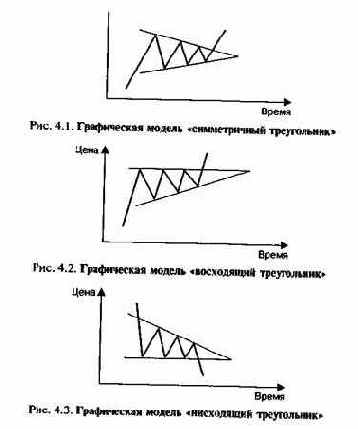 Одной из наиболее часто встречающихся на ценовых графиках моделей продолжения тенденции являются треугольники Существуют три вида треугольных моделей: симметричные восходящие и нисходящие. Симметричный треугольник образуется двумя сходящимися трендовыми линиями, из которых нижняя линия поднимается, а верхняя опускается (рис. 4.1). Восходящий треугольник имеет горизонтальную верхнюю линию тренда и восходящую нижнюю (рис. 4.2). Нисходящий треугольник, напротив имеет горизонтальную нижнюю линию тренда и нисходящую верхнюю (рис. 4.3).