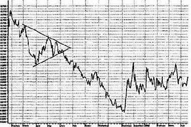 Однако решающее значение в определении направления следующего за треугольником тренда имеет направление пробоя треугольной формации. Иногда после пробоя наблюдается возвратный ход цен к линии тренда. В зависимости от направления тенденции пробитая трендовая линия треугольника может стать уровнем поддержки или сопротивления. Примеры реализаций графических моделей треугольного типа приведены на рис. 4.4—4.13.
